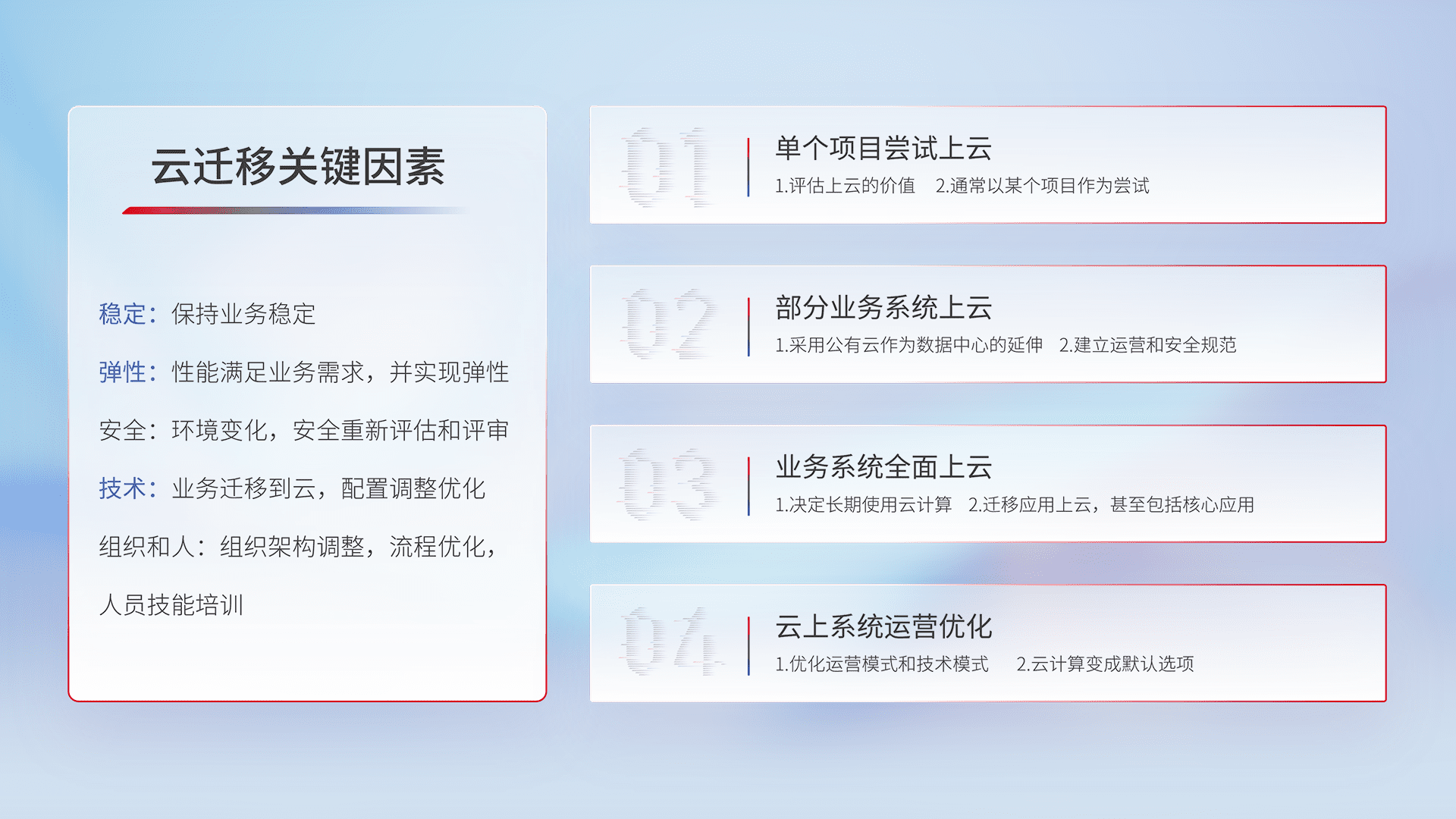 结合实际业务,,,从规划设计、、云平台选型、、、、云原生改造、、、数据迁移、、集成交付,,迁移全过程为客户识别最佳上云路径,,,,做好风险识别管理,,,,设计网络架构、、、身份权限、、安全审计合规、、操作审计、、、日志审计、、、监控告警策略、、、、多站点容灾设计等,,,对云上基础设施进行整体规划,,,,提升IT治理水平,,以满足弹性、、高可用、、高性能的需求。。。