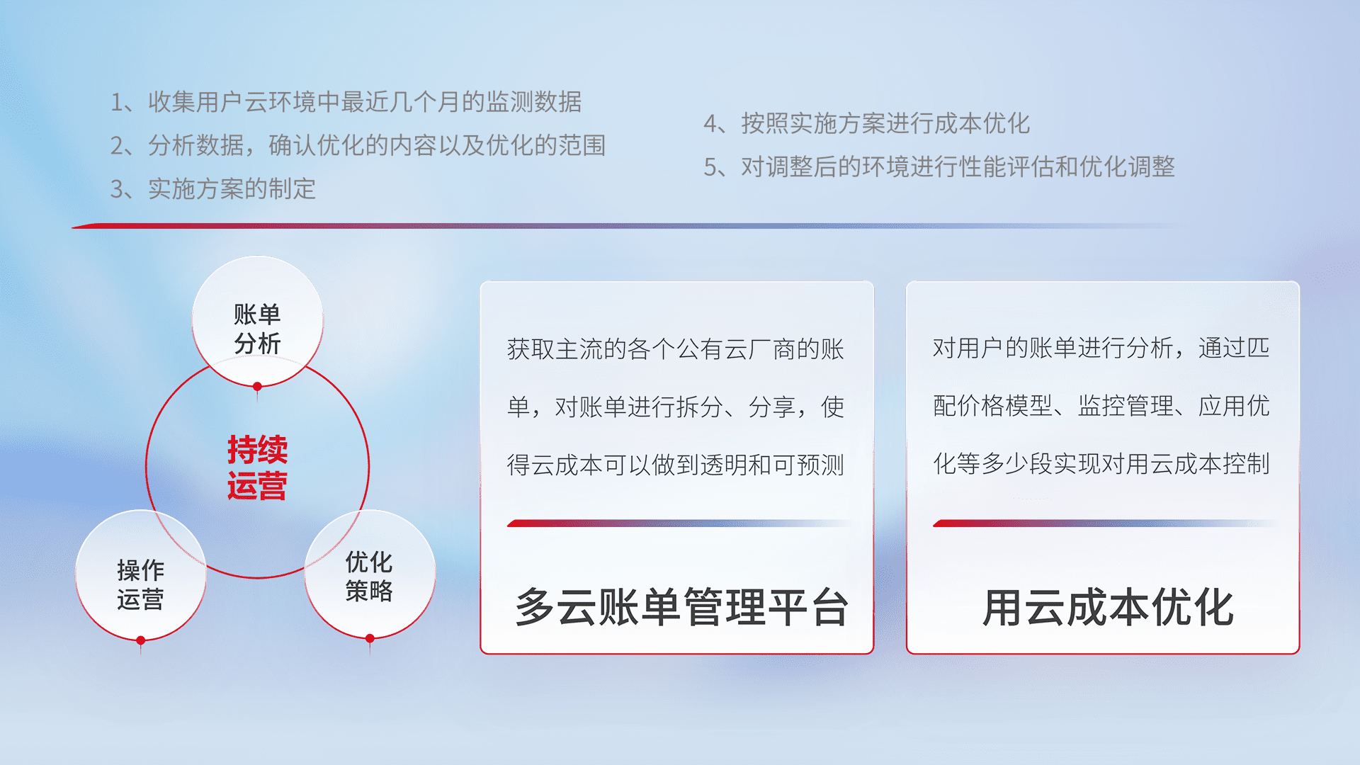 通过多云纳管,,,以统一的资源数据模型把客户的云资源进行抽象和封装,,进而实现对多云资源的统一操作,,保障云资源管理的可靠性、、、、稳定性与可用性。。量身定制化运维内容,,,,配置、、开发运维、、补丁管理、、、、备份、、、监控、、、认证和访问管理、、、审计和日常巡检等,,,保障在用云过程中的可靠度,,,,稳定度以及高可用率。。。。